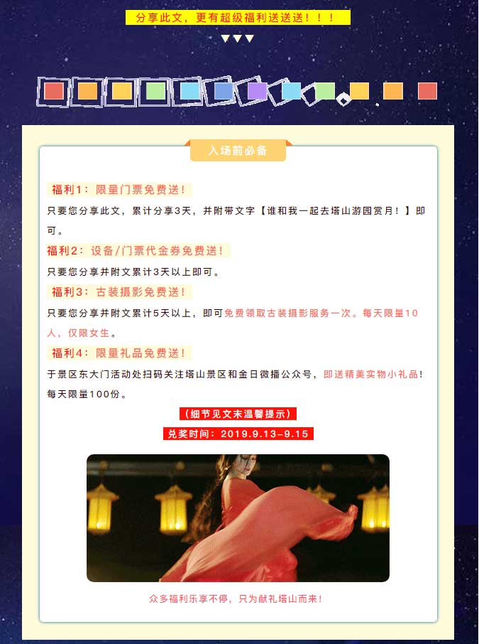 只要您分享此文,累計分享3天,并附帶文字【誰和我一起去塔山游園賞月!】即可。